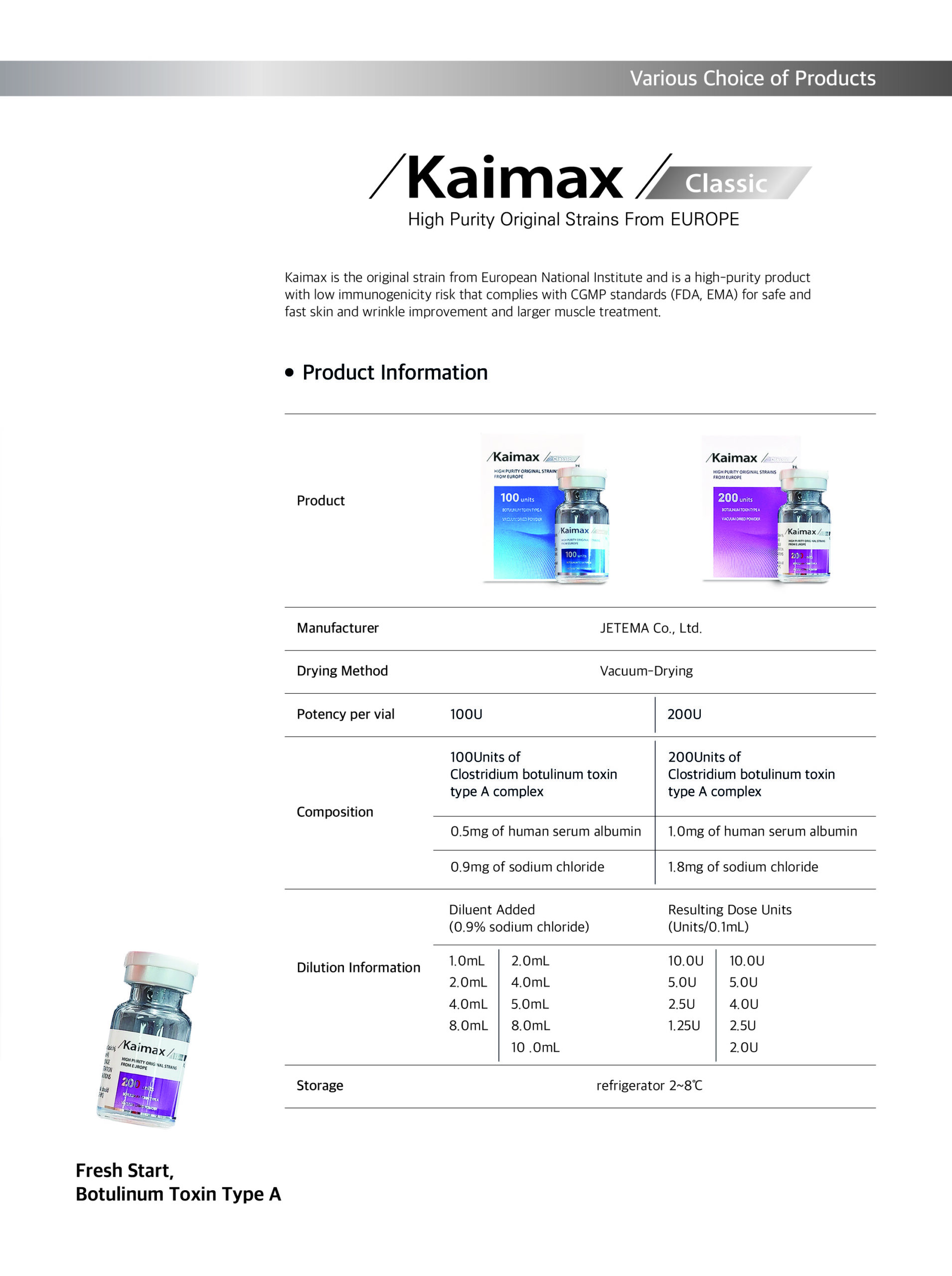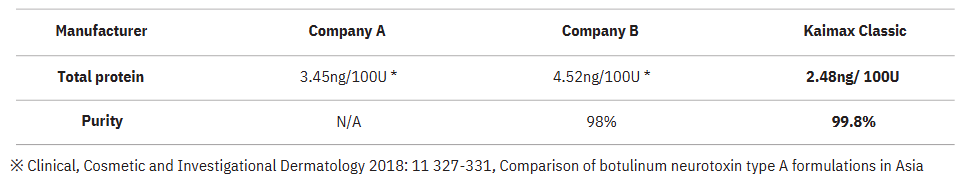 Kaimax เป็นสายพันธุ์ดั้งเดิมจากสถาบันแห่งชาติยุโรปและเป็นผลิตภัณฑ์ที่มีความบริสุทธิ์สูง มีความเสี่ยงผลต่อภูมิคุ้มกันต่ำตามมาตรฐาน CGMP (FDA, EMA) เพื่อความปลอดภัยในการรักษาปัญหาผิว, ริ้วรอยและรักษากล้ามเนื้อขนาดใหญ่